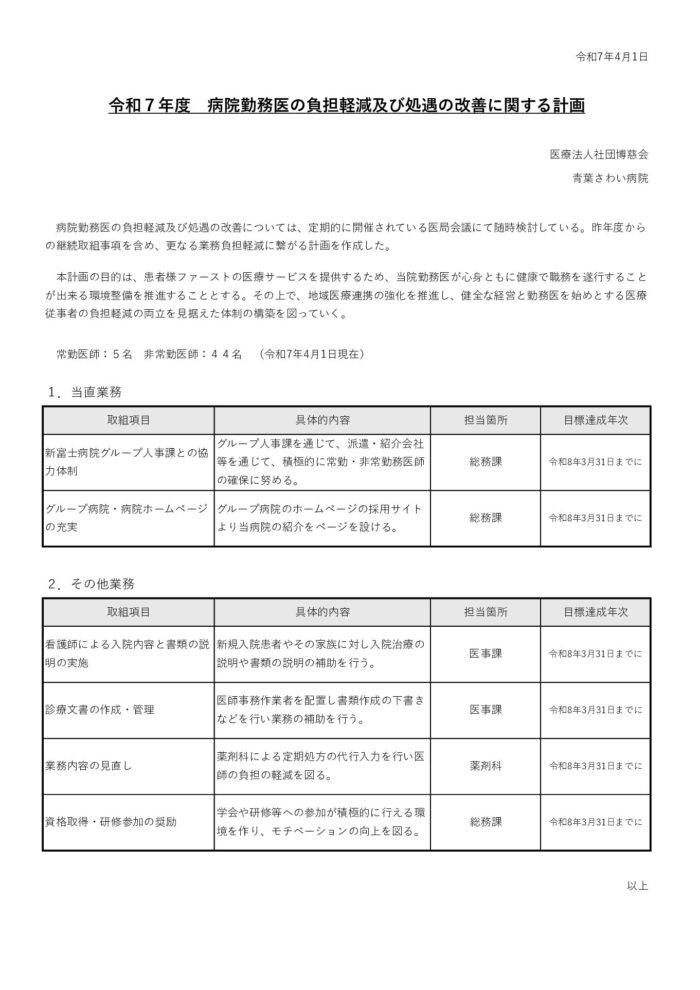 令和7年度 病院勤務医の負担軽減及び処遇の改善に関する計画