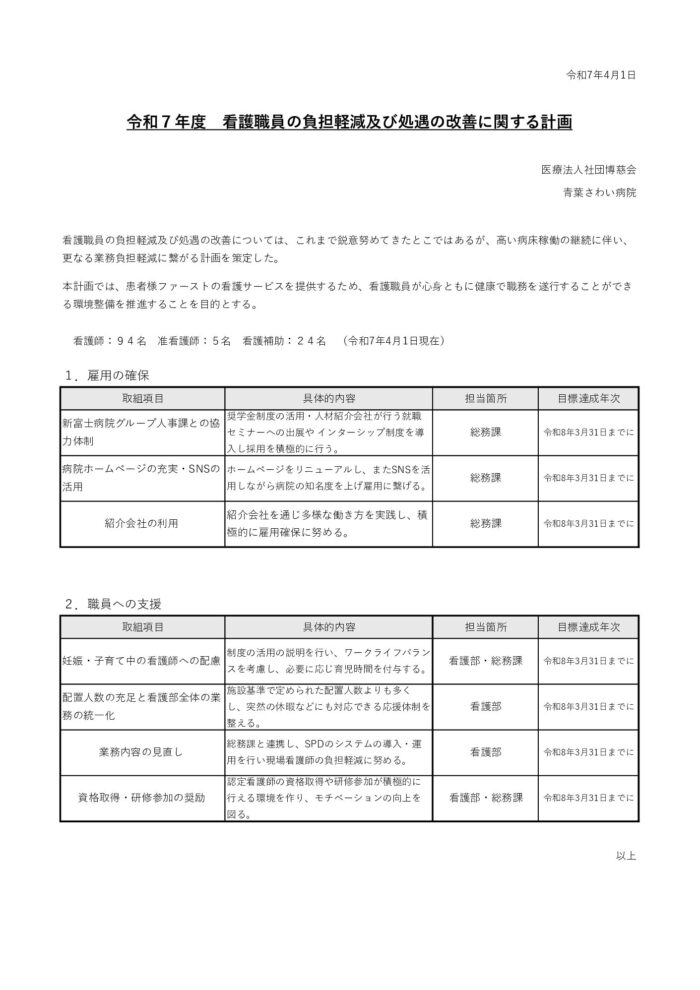 令和7年度 看護職員の負担軽減及び処遇の改善に関する計画