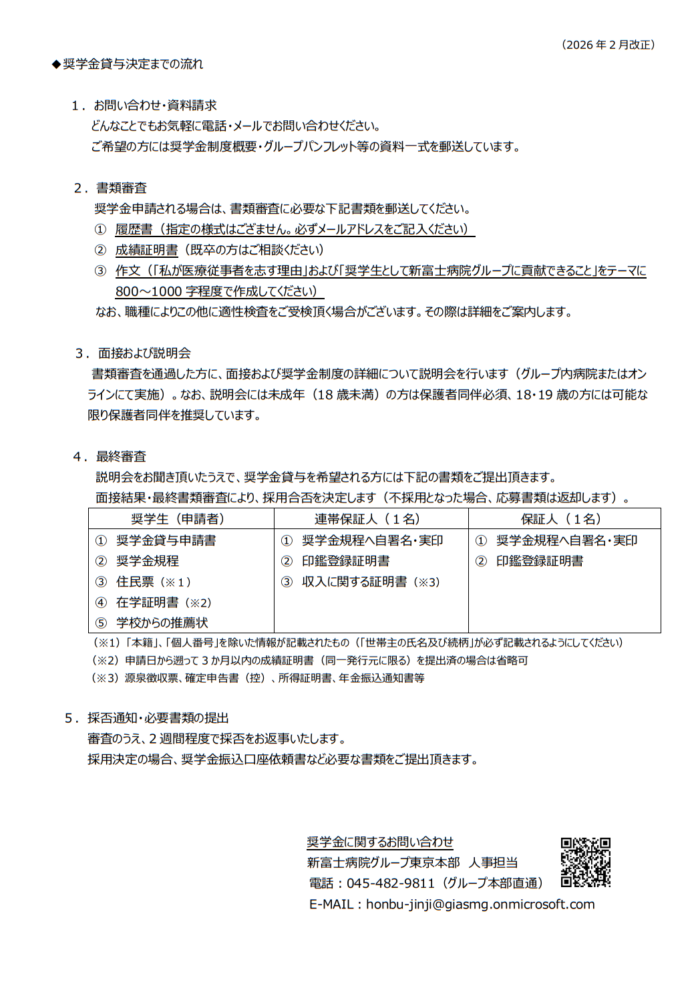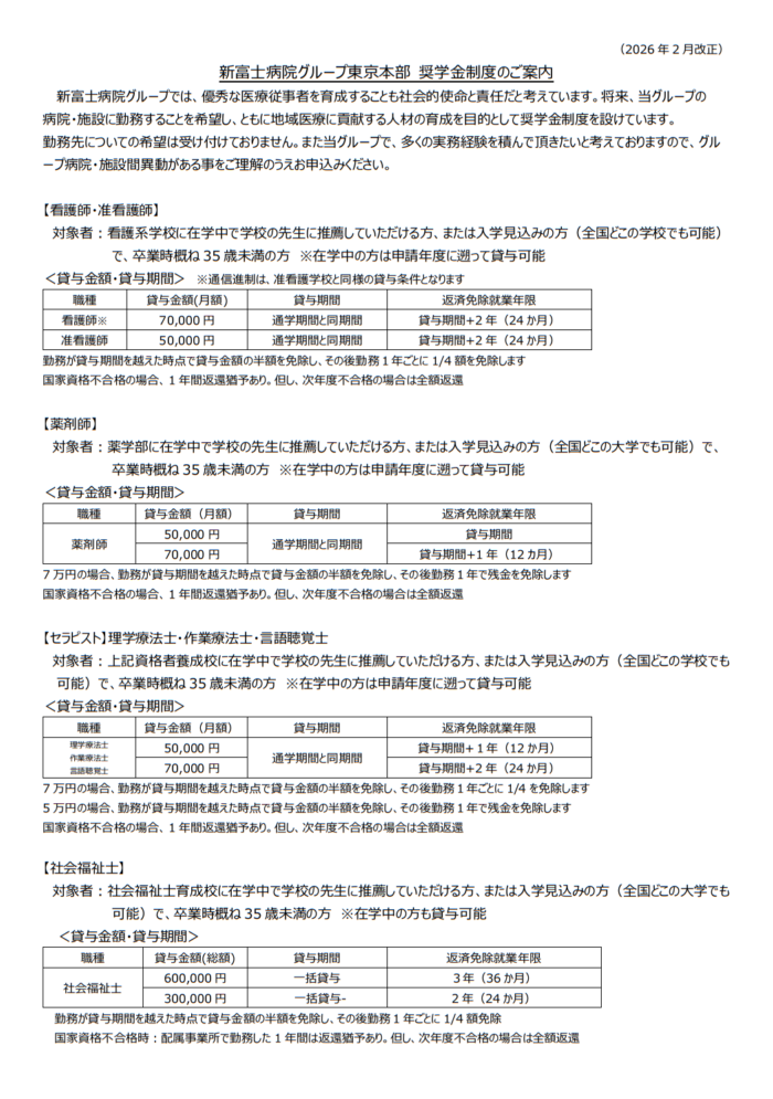 2026年2月10日(火曜日) 奨学金制度のお知らせ 新富士病院グループでは、優秀な医療従事者を育成することも社会的使命と責任だと考えています。将来、当グループの病院・施設に勤務することを希望し、ともに地域医療に貢献する人材の育成を目的として奨学金制度を設けています。詳細は下記案内をご覧ください。