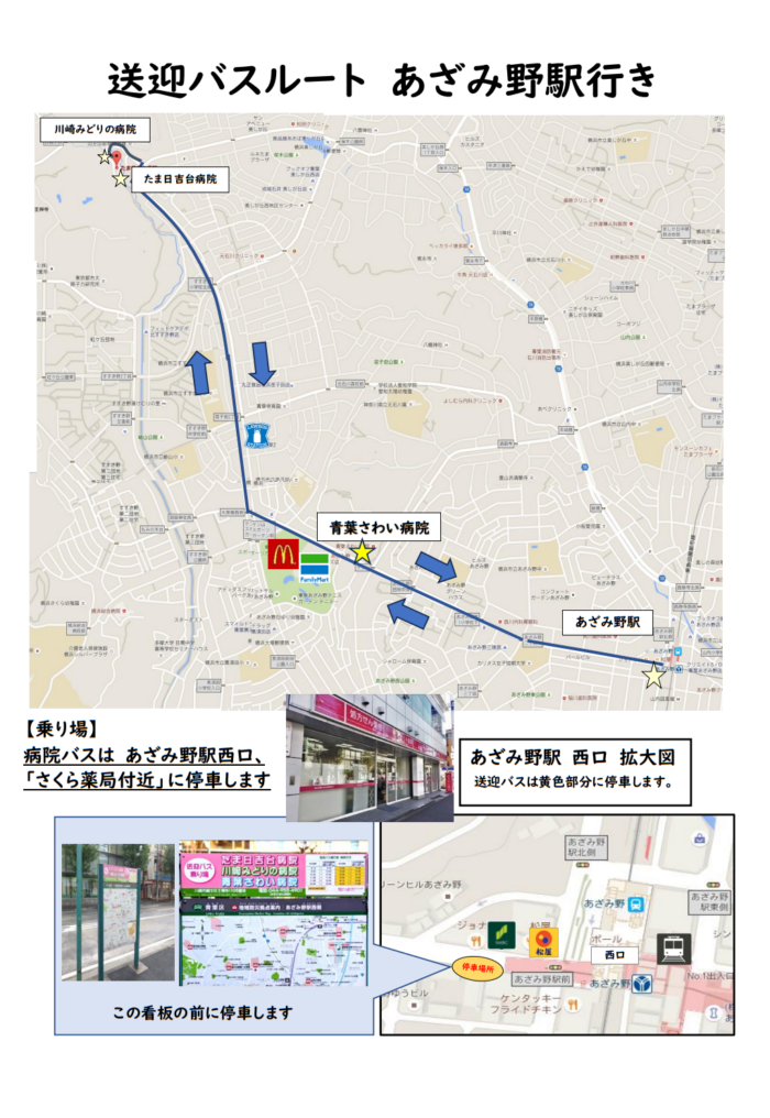 あざみ野駅から、無料送迎バスをご利用いただけます。病院正面玄関で停車します。