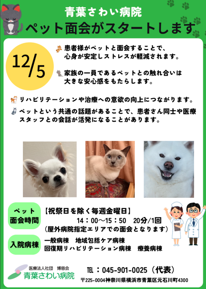但し期限が過ぎた場合は改めてご提示をお願い致します。提示の無かった場合、面会は出来かねます。 - ペット面会は、屋外の病院指定エリアでの面会となりますので、面会場所は下記■面会場所をご参照下さい。